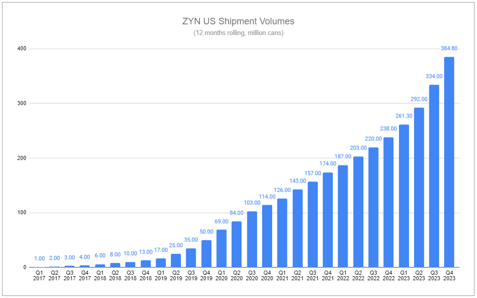 ZYN continues to spread across the United States like wildfire, with 12-month rolling shipped volumes increasing to 384.8 million, up 61.8% from last year. Disaggregating quarterly shipped volumes further shows the recent acceleration, with Q4 shipped volumes reaching 116.3 million, up ~78% from last year's quarter.