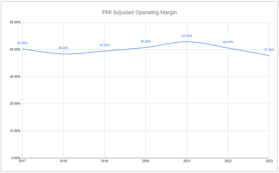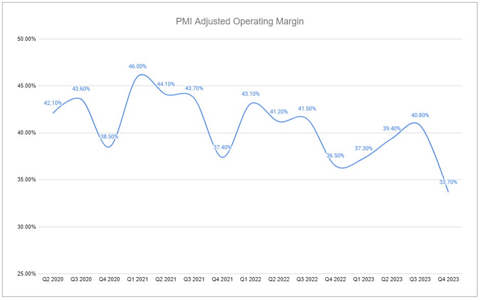 With the top portfolio of combustible products led by the flagship Marlboro brand and a headstart in next-gen categories with IQOS, further cemented by the acquisition of Swedish Match, Philip Morris International is seen as the industry leader and continues to trade at a notable premium to its peers. It's a clean story, and the company's 2023 results included various figures underscoring such an advantaged position. More aggregate volumes. More brand loyalists. More market share growth. But at the same time, several points raise the question of if the story is too clean: more adjustments and more headwinds. Depreciation of the Argentine Peso immediately snaps us back to a reality that has continuously provided significant FX pressures; the Wellness & Healthcare segment continues to need medical aid; heightened costs and reinvestment mute reported results. In Q4 2023, the seasonally weak adjusted operating margin appeared even more feeble. People are questioning if the downward movement in operating margin over the last several years is a structurally permanent feature of the business as it shifts to a greater mix of smokeless products. I think not.