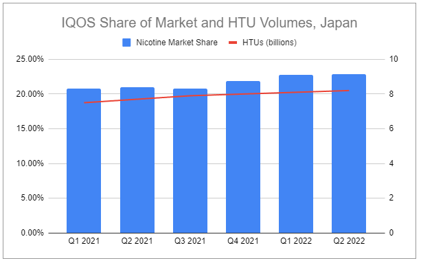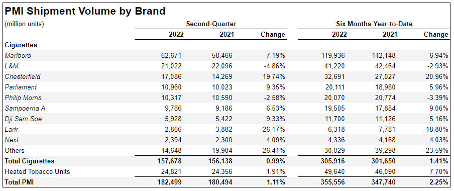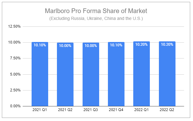 Marlboro has been the #1 cigarette in the world for 50 years, and Marlboro volume growth for Q2 2022 was an astounding 7.19% y/y, driven largely by reopenings leading to higher social occasions and purchase frequency. That type of growth is very a-typical, but the brand’s market share has remained extremely stable recently:
