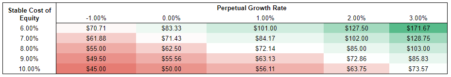 Philip Morris International holds many distinct factors that will likely lead to it growing by more than a theoretically capped terminal rate of 3% for quite some time. Despite that, simply going through the motion of calculating the implied value using the current annualized dividend of $5.00 presents the following range: