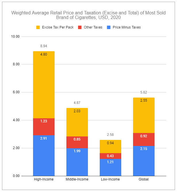 These overall dynamics lead to a gigantic spectrum of consumer prices. In Australia, a pack of Marlboro (the leading cigarette brand, owned by PMI) costs over $26 USD equivalent, whereas in Nigeria, a pack of Marlboro costs ~$0.97.