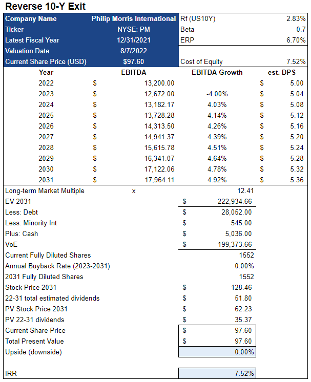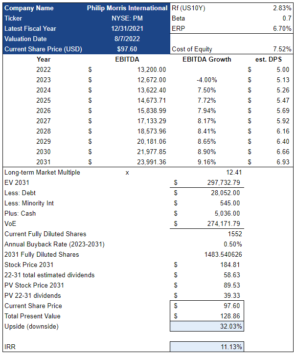 I valued Philip Morris International using a 10-year exit based on backing out equity from an EV/EBITDA multiple and factoring in forecasted dividends and share repurchases.