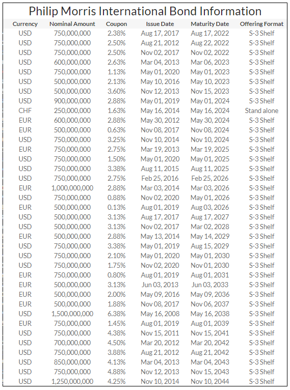 The majority of Philip Morris International’s bonds were issued at incredibly favorable rates and are easily serviceable. However, with the announcement of PMI’s bid for SWMA, credit rating agencies have placed PMI on watch for a possible downgrade, contingent on the specifics of the deal closing. Even if that were to occur, PMI’s rating would fall a single notch, and I do not see that impacting the company to any material extent. The likely result of successfully acquiring SWMA would be for PMI to keep its share repurchase program suspended, as well as refrain from additional M&A until ~2025 as the company de-leverages. With strong brands, geopolitically diverse operations, and exceptional capital allocation, I expect PMI management’s use of debt to continue to bode well for the firm.