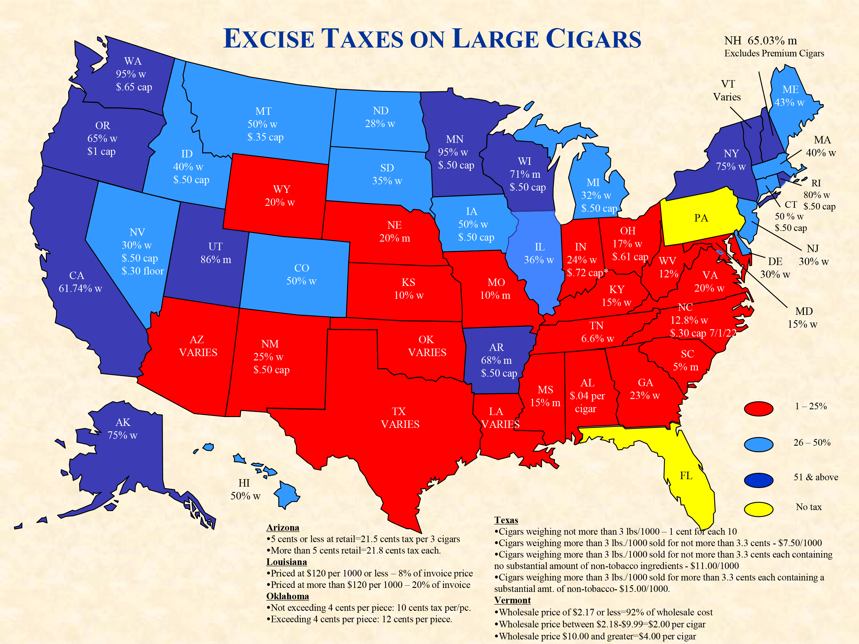 United States federal excise taxation varies widely across tobacco product categories. While cigarettes are currently taxed at a rate of $1.01 per pack of 20, large cigars (cigars that weigh more than 3 pounds per 1,000) face a federal excise tax of 52.75% of the manufacturer’s sales price, with a maximum tax of $0.4026 per cigar. Additionally, unlike cigarettes, large cigars face no MSA payments.