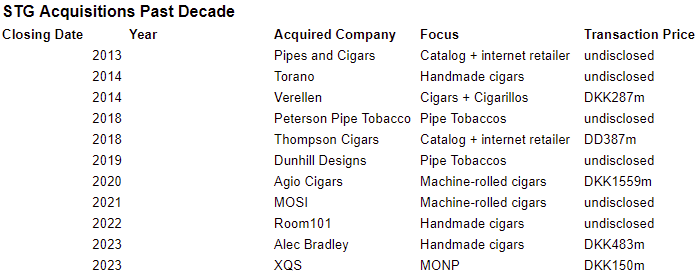 Undisclosed price transactions represent small targets. Due to the challenging nature of this industry, many small players struggle to navigate the ever-changing global regulatory landscape, manage complex supply chains, and establish and retain relationships with suppliers, distributors, and various trade groups. By leveraging its lower cost of capital and existing vertically integrated infrastructure, Scandinavian Tobacco Group is able to recognize significant synergies through dealmaking by reducing overhead costs. Even larger targets, like Agio, perfectly illustrate the group’s ability to execute.