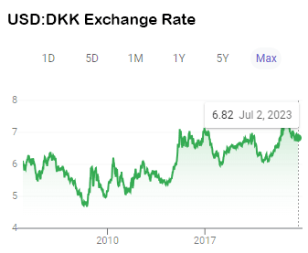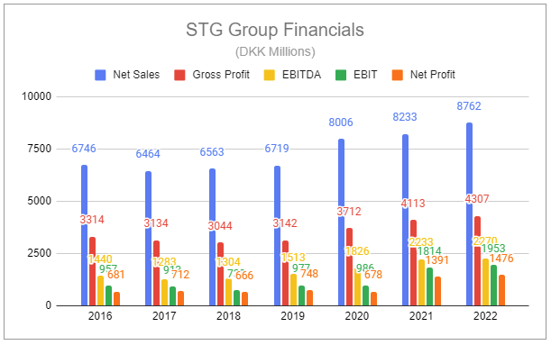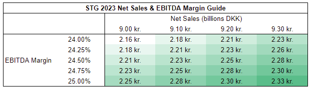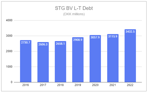 STG’s debt is a mix of bank loans and a revolving credit facility at a floating rate, and bonds denominated in EUR at a fixed rate. The company has historically used swaps and other derivatives to offset movements in interest rates and FX rates. It is estimated that a 10% change in the USD/DKK FX rate would impact company sales by ~5% with EBITDA margins only slightly impacted. At the time of publishing this piece, 1 USD is equivalent to 6.824450231 DKK (1 DKK = 0.14653195 USD).