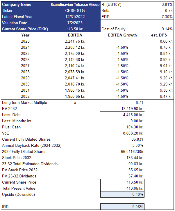 But what if one is overestimating what this company is capable of? What if consumption patterns of handmade cigars in the U.S. did peak in 2022 and are going to decline at a faster rate? What if the company continues its string of acquisitions but fails to recognize synergies as it has in the past? What if the company ends its track record of efficiency gains? What if pricing power begins to have a less pronounced impact? What if? What if? What if? I created a rough 10-year exit model based on backing out equity from an EV/EBITDA multiple and factoring in forecasted dividends and share repurchases to answer.