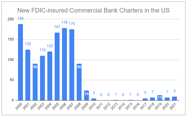 The Great Financial Crisis is another prime example. Ignoring the bailouts and the changes in capital requirements for financial institutions, the difficulty of acquiring a new bank charter increased tremendously. New competition for existing banks is almost nonexistent: