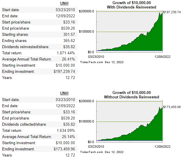 From the day of the ACA passing to the present, an investment in UNH would have grown to 17.3x, or 19.7x with dividends reinvested: