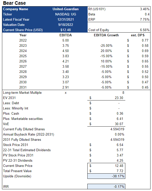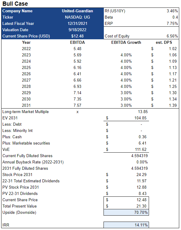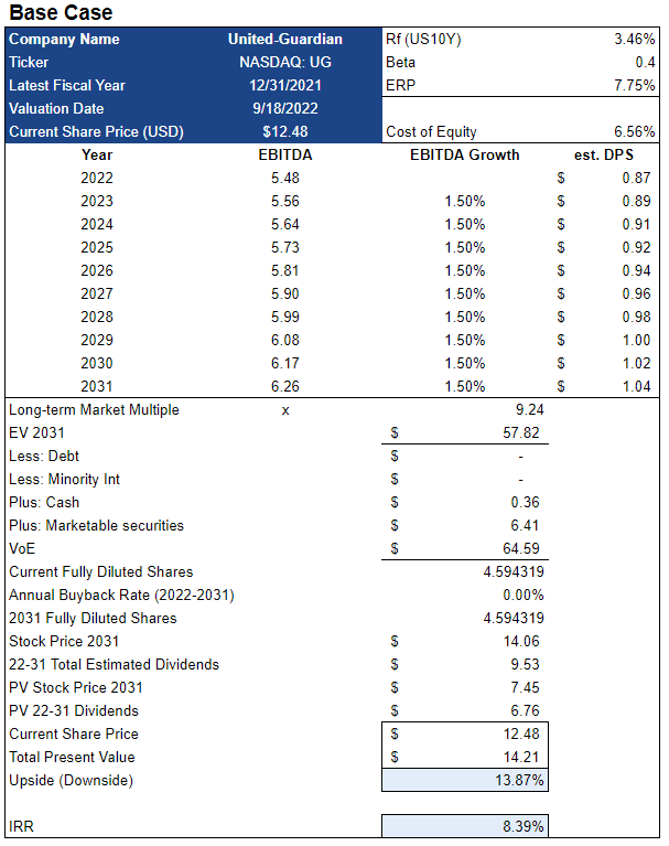 I also valued United-Guardian using a 10-year exit based on backing out equity from an EV/EBITDA multiple and factoring in forecasted dividends. As with most other names I’ve covered, continued operations are incredible capital-light, and total reinvestment costs are fairly stable and predictable.