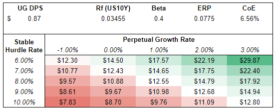 United-Guardian’s average annual dividend payment from 2006-2021 was $0.8725. To reflect more recent results, the average annual dividend payment from 2016-2021 was $1.038 and $0.996 when excluding special dividends. I decided to use the 2006-2021 average as the basis for this exercise. I also opted to focus the outputs on a hurdle rate higher than the company’s cost of equity.