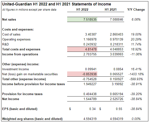 United-Guardian has shown very mixed results for H1 2022. Net income was significantly lower than a year prior—down a whopping 39%! This should raise eyebrows. However, there are several critical points to take into account: