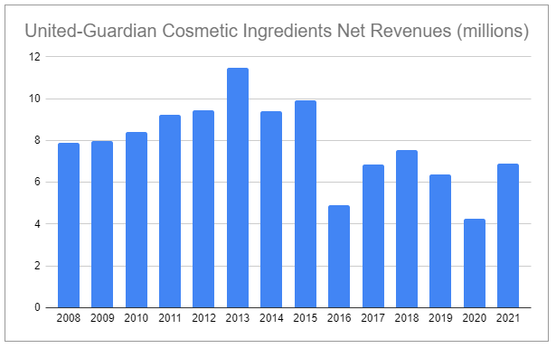 United-Guardian is beginning to face heightened competition for many of its cosmetic ingredients. While the company undeniably produces high-quality ingredients, there has been a notable increase in Asian manufacturers aiming to offer low-price alternatives. UG has stated it is working to develop its own lower-priced lines. This may support volumes but will ultimately compress margins if successful. Aside from this, UG is also pursuing the development of natural and preservative-free products as well as products in low-competition niches. Historically, the company has proven to succeed with this strategy and is one I am much more supportive of.