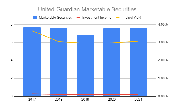 United-Guardian’s leadership has always been extremely conservative in managing its balance sheet. The earliest record I could find of the company holding marketable securities was in its 1998 annual report—$ 822,596 in total, and it has grown considerably since.