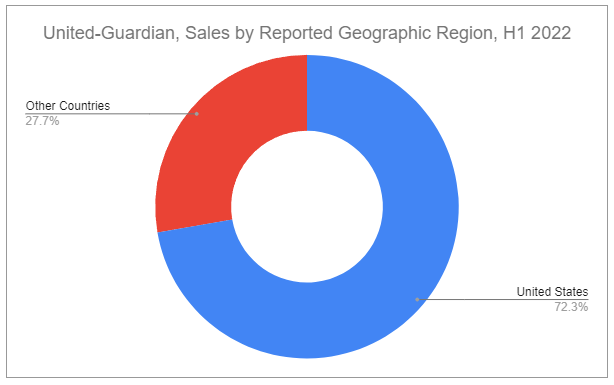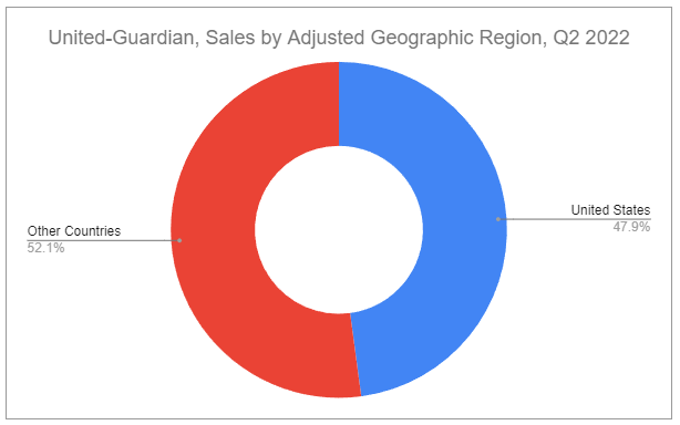 Ashland Specialty Ingredients (ASI, NYSE: ASH) is by far the largest partner of United-Guardian, accounting for roughly 35% of total sales in the second quarter of 2022. Critically, substantially all purchases by ASI are shipped to ASI’s warehouses located in the U.S., and all sales to ASI are reported as U.S. sales for United-Guardian’s financial reporting purposes. However, in Q2 2022 ~75% of ASI’s related sales were to foreign customers, which China representing 46%. Adjusting for this, it becomes apparent that UG is more reliant on foreign sales than first glance suggests.