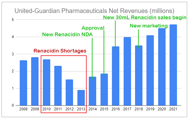 Renacidin is unlikely to ever have a giant market share. But it doesn’t need one to contribute meaningful returns for United-Guardian’s shareholders. Increased awareness boosting sales paired with modest pricing can likely produce very impressive results. I believe that the success of the newest version of Renacidin continues to be overlooked by the market. This is a growing, highly-profitable, niche pharmaceutical that now makes up a significant chunk of sales for United-Guardian.
