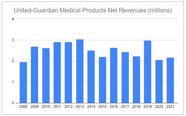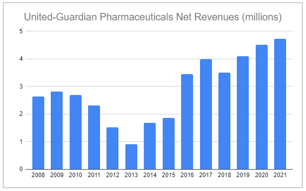 United-Guardian has historically engaged in a number of government programs that include rebates and discount programs for its products. In October 2020, UG determined it was no longer profitable to participate in the Medicaid or 340B programs. On October 30, 2020, UG informed the Center for Medicare & Medicaid Services (CMS) and the HRSA that it intended to terminate its Medicaid Drug Rebate Agreement and its 340B Drug Pricing Agreement, effective at the end of 2020. The company stated it would continue to participate in other programs such as the Veterans Affairs FSS Program and Medicare Part D Coverage Gap Program (CGDP). This had a positive impact on FY 2021 results, and I expect this will continue to reduce sales growth but widen margins and ultimately increase profitability.