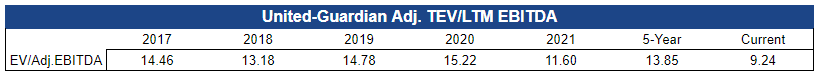 Adjusting United-Guardian’s EV/EBITDA by backing out its portfolio of marketable securities indicates it is currently trading at a substantial discount relative to the past 5 years: