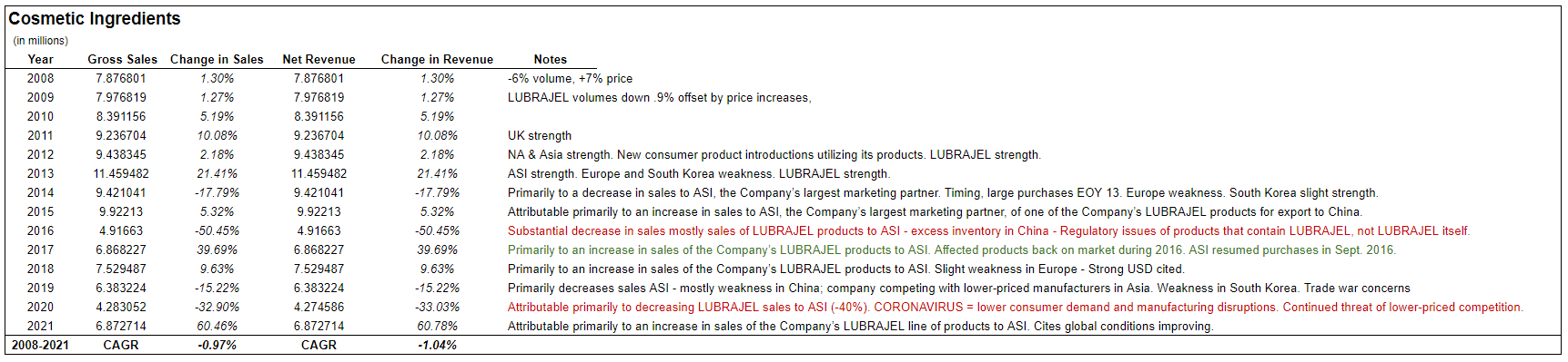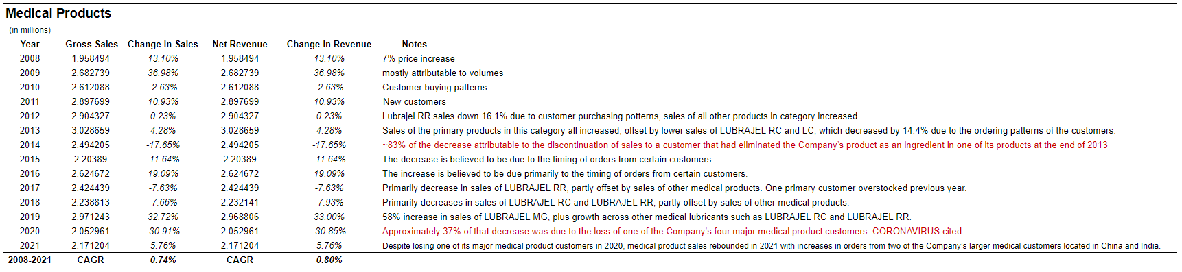 The reliance on marketing partners, customer concentration, and exposure to global macro factors are evident in the category’s historical performance. While most years show steady growth, in 2016 a product that contained Lubrajel faced regulatory issues in China (unrelated to Lubrajel). This alone led to a ~50% drop in sales for the year. Likewise, in 2020, COVID led to a ~33% drop in sales due to low consumer demand for finished products as well as disruptions to manufacturing in Asia.