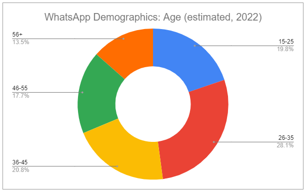 Meta does not break out WhatsApp from the rest of FoA but the above comment should catch your attention. At over 2 billion, WhatsApp DAUs are larger than that of any other social media platform, including Facebook’s 1.984 billion as of Q3 2022. Additionally, the platform sports strong demographic mixes, including nearly half of the users estimated to be between ages 15-35: