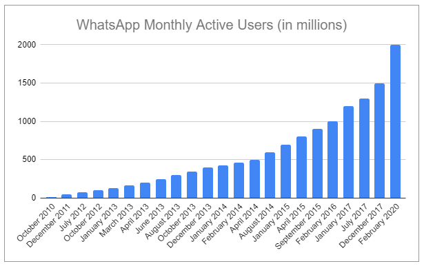 WhatsApp was developed to be platform-agnostic and with a mobile focus, making it compatible with nearly all smartphones. It has also always been free to send and receive messages through WhatsApp, which is critical in countries where consumers can’t afford plans where they are charged for messaging. And instead of signing up and creating a username and then asking people for their username to connect, you simply used your mobile number. These factors made WhatsApp not only easy to use but also outrageously affordable, especially for those in developing countries who began to see it as the way to communicate. But there was still one barrier to entry: payment. However, in January 2016, WhatsApp scrapped the annual subscription fee, making the app completely free for users. Since then, the achieved network effect has been awing: