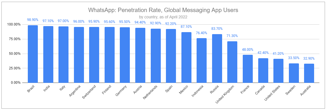 In India, the country with the greatest number of WhatsApp users, for example, people rely on WhatsApp to communicate with friends, family, and colleagues, buy and sell items, send money, read news, and even access personal medical information. In other countries, like Brazil and Indonesia, total usage and use cases indicate the app may be more important than any other; including Facebook, Instagram, TikTok. Even in Russia, when Facebook and Instagram were banned following Russia’s invasion of Ukraine earlier in the year, WhatsApp was untouched. Popular throughout the country, it is clear that the Kremlin worried that blocking WhatsApp could generate significant blowback and loss of public support.
