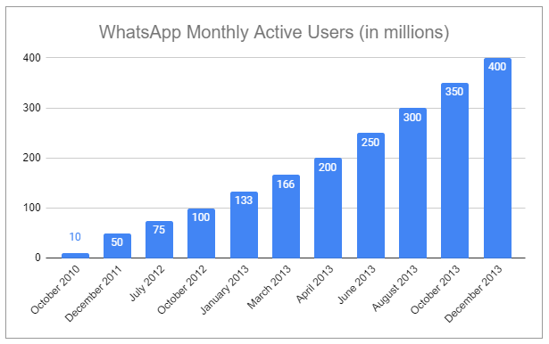 In early 2011, after months of negotiation, Sequoia Capital invested ~$8 million for ~15% of the company. Within two years, monthly active users had crossed 200 million, and Sequoia invested another $50 million, valuing WhatsApp at $1.5 billion. The company also changed its model from a one-time fee to free upfront with a $.99/year subscription thereafter. But that didn’t slow the company down, and by the end of 2013, monthly active users had doubled to 400 million.