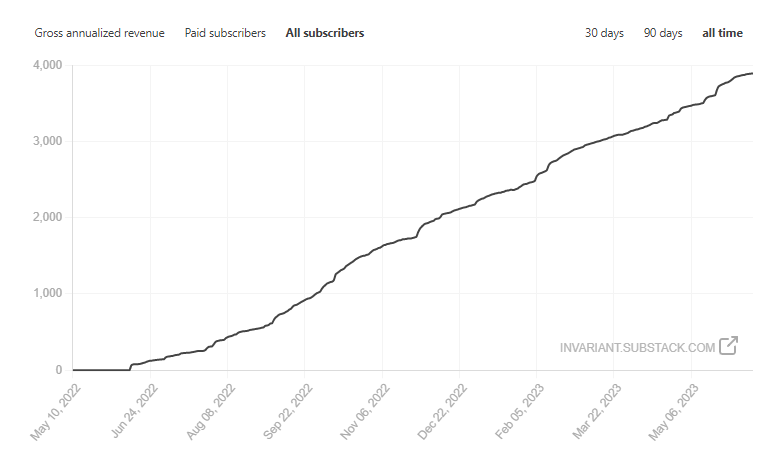 The growing interest in Invariant, from 0 to nearly 4,000 subscribers, has exceeded all reasonable expectations. But there was never an aha! moment. No virality. No tricks. The steady ascent reflects the nature of the experiment.
